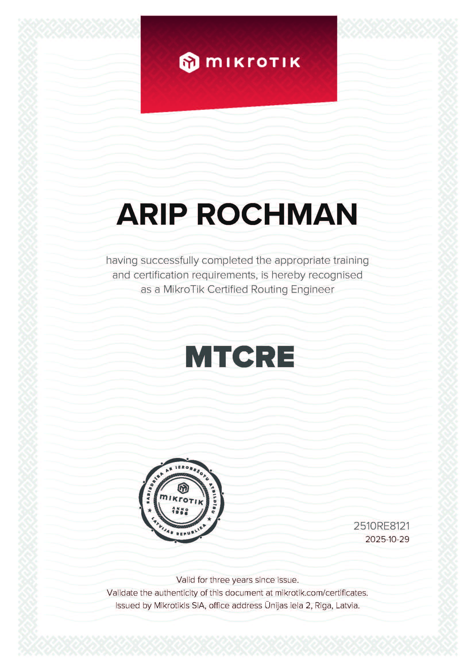 Sertifikat yang dikeluarkan merupakan sertifikat bertaraf Internasional (bila siswa lulus ujian dengan nilai > 60%), siswa akan mendapatkan gelar sebagai MikroTik Certified Network Associate (MTCNA).